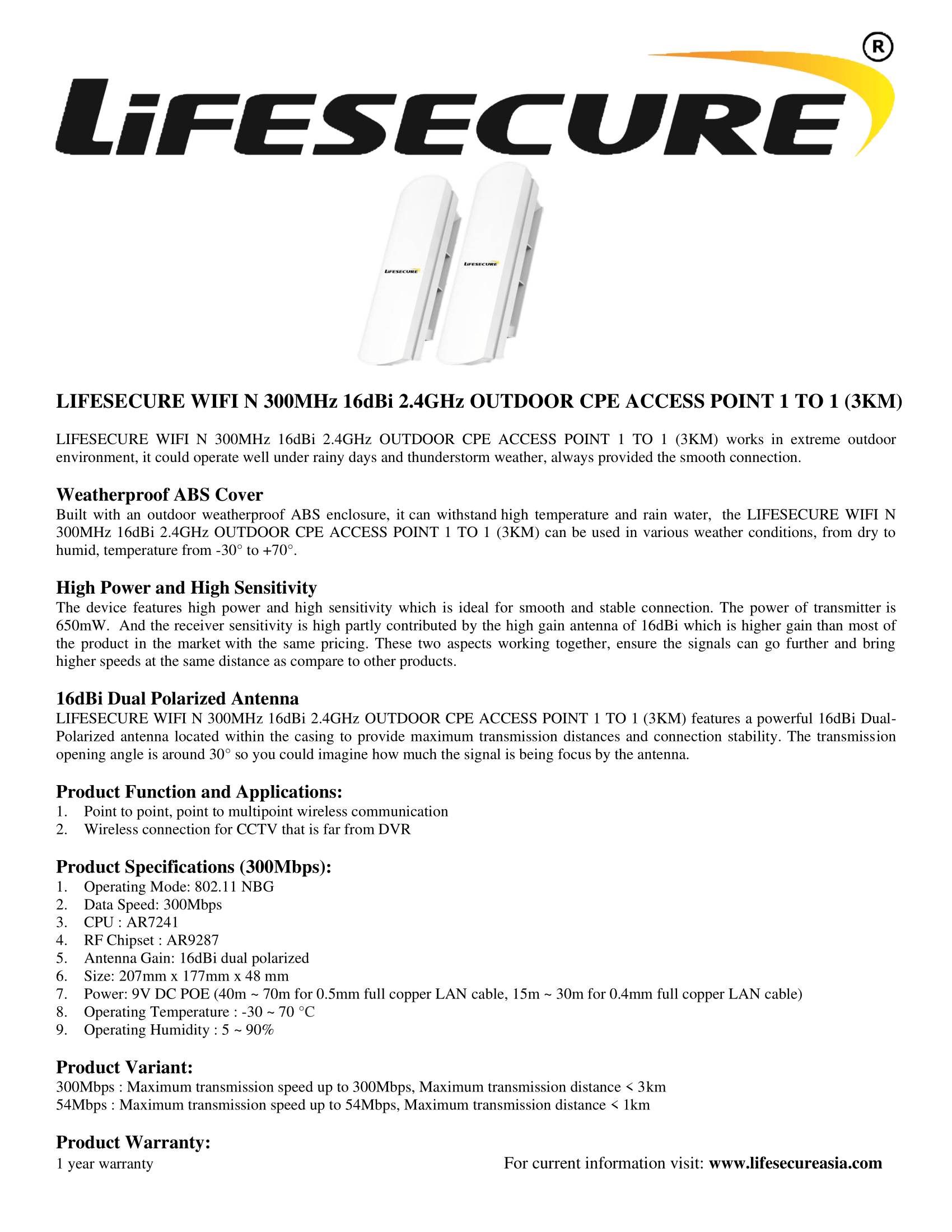 LIFESECURE Wi-Fi N 300MHz 16dBi 2.4GHz Outdoor CPE Access Point 1 to 1 (3km)