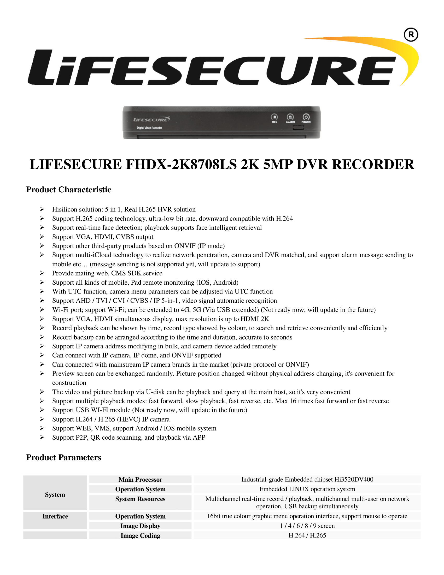 LIFESECURE FHDX-2K8708LS 2K 5MP DVR Recorder